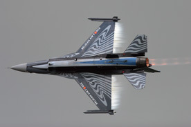 The MiG was joined in the flypro by Mitch Beulen in the Belgian Air Force F-16 and he gave a very good account of himself with a lively routine which made liberal use of flares and felt a little bit shorter than last year's display, which, to my mind anyway, was two or three minutes too long, especially when flares weren't being used. Flt Lt Jules Fleming certainly wasn't overawed by all the afterburning behemoths on view and is undoubtedly one of this year's most consistent performers, earning herself a stirring round of applause from what was a very appreciative audience throughout.