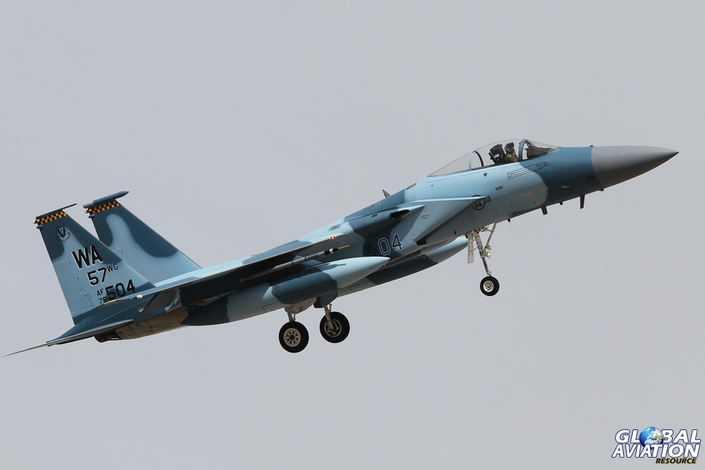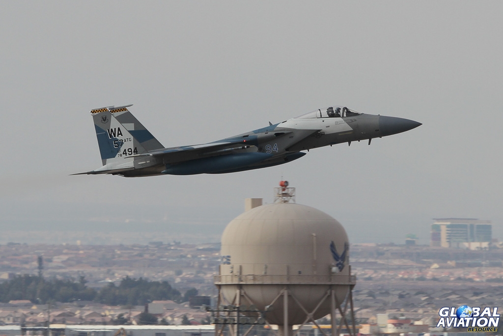 Marked for the 57th ATG, this F-15C is turning finals for Runway 21R in a classic Nellis shot © Chris Wood – globalaviationresource.com