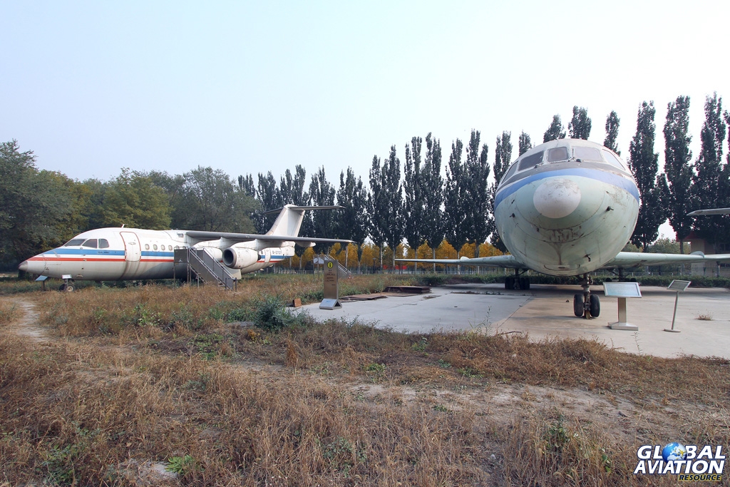 Beyond a path and some trees sit three jet-powered aircraft.  Ex-China Eastern Bae146-100 B-2701 was the first example of the ‘146 to arrive in China when delivered to China Northwest Airlines in September 1986.  The aircraft sports the cheatlines of its original operator but without the titles or tail logo.