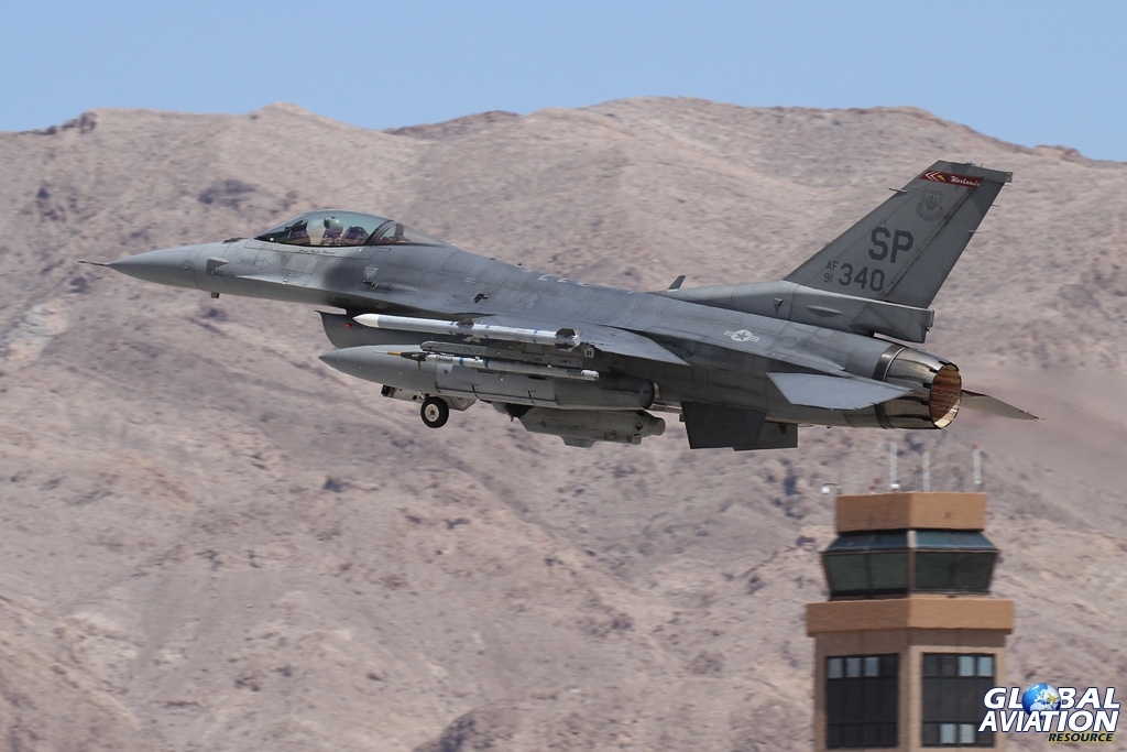 A ‘Warhawks’ F-16C on it’s way to the ranges, passing the distinctive control tower at Nellis © Chris Wood – globalaviationresource.com
